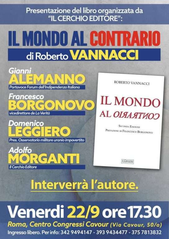 “Oltre all’autore e ad Adolfo Morganti, interverranno anche il vice Direttore della Verità Francesco Borgonovo, che ha scritto la prefazione a questa edizione, e Domenico Leggiero, presidente dell’Osservatorio Militare che ha tutelato i militari colpiti dalle contaminazioni da uranio impoverito. Sarà una occasione importante non solo per dare un’articolata risposta alla demonizzazione delle idee del Gen. Vannacci, ma anche per fare la giusta luce su tutta questa vicenda”. La presentazione del libro è stata organizzata da “Il Cerchio editore” venerdì 22 settembre alle ore 17 presso il Centro Congressi Cavour (Via Cavour, 50/a Roma).