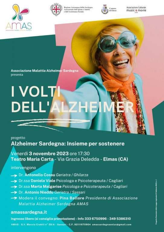 Venerdì 3 novembre, alle 17.30 negli spazi del Teatro Maria Carta in via Grazia Deledda a Elmas, si terrà il convegno “I volti dell’Alzheimer”, per approfondire i temi dell’invecchiamento della popolazione sarda (con una particolare attenzione alle demenze), di disturbo comportamentale, di prevenzione, di terapia non farmacologica e dell’importanza dei centri diurni.