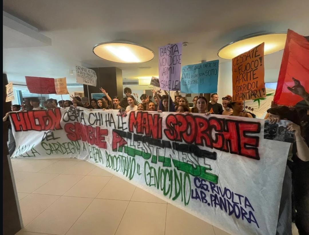 “Hilton ospita chi ha le mani sporche del sangue palestinese“, recita la scritta sul grande striscione srotolato all’interno dell’ingresso dell’albergo in cui attiviste e attiviste hanno presenziato per circa un’ora.