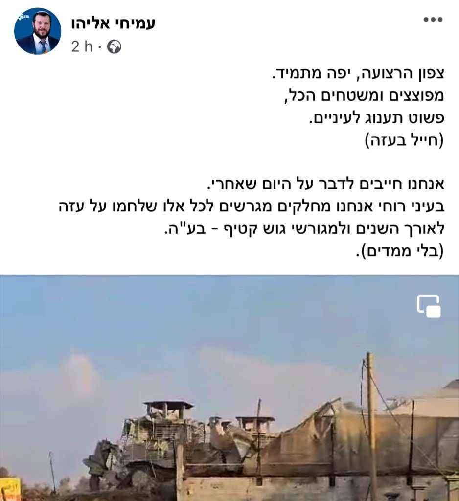 Il Ministro degli Affari e del Patrimonio di Gerusalemme di Israele, Amichay Eliyahu: «Gaza nord, più bella che mai. Fate esplodere e spianate tutto, delizioso. Dobbiamo parlare del giorno dopo. Quando avremo finito, assegneremo le terre di Gaza ai soldati che combattono e ai coloni che vivevano a Gush Katif».