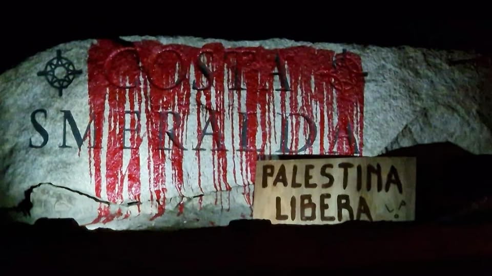 Vernice rossa è stata versata dagli attivisti pro Palestina sopra la roccia che segna l’ingresso nella Costa Smeralda.