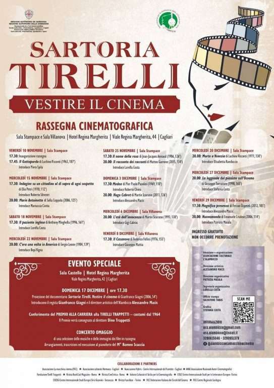 Dal 10 novembre al 29 dicembre nella sala Stampace e nella Sala Villanova di viale Regina Margherita 44 a Cagliari, si terrà la rassegna cinematografica “Sartoria Tirelli. Vestire il cinema”, che accompagnerà gli appassionati per dodici appuntamenti, che includono il conferimento del premio alla carriera e il concerto del maestro Romeo Scaccia.