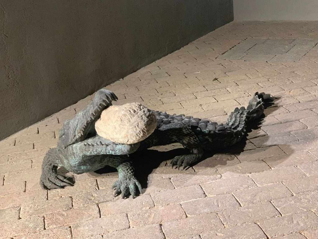 Vezzoli ha non lavorato sito specific (capite quanto sia necessario il lavoro della fondazione morra in una realtà come Napoli?), ripreso una sua precedente installazione, realizzata per Piazza della signoria a Firenze (ma come?), dove il coccodrillo ha tra le fauci una testa romana del secondo secolo d.C., testa proveniente da Palmira (sito archeologico siriano sistematicamente distrutto e depredato dal terrorismo islamico), l’installazione in Piazza della signoria si chiamava “pietà”, immagino si sia conservata la didascalia, e che la testa del romano impero, sia diventata metaforicamente quella di un’amante della regina.