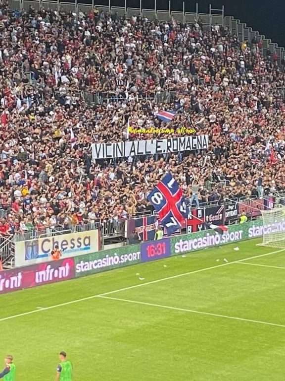 “Vicini all’E. Romagna”, gli ultras del Cagliari hanno esposto in curva nord, nella partita di ieri contro il Venezia, uno striscione tributando solidarietà all’Emilia Romagna.