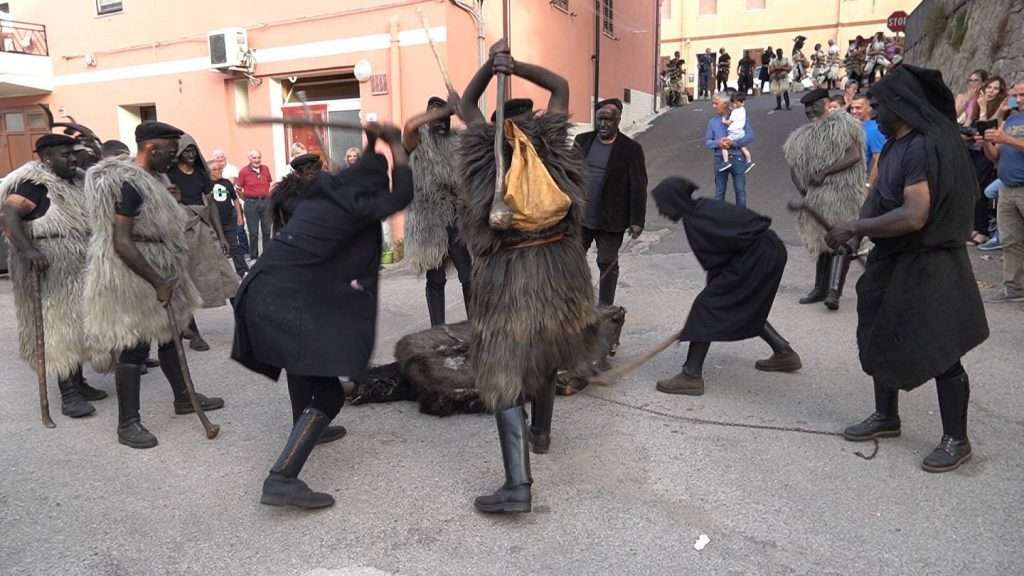 I gruppi hanno prima mostrato le fasi della vestizione nei giardini dedicati a Veronica Fadda. Dopo aver carbonizzato (in sicurezza) col fuoco alcuni pezzi di sughero per ricavare “su tintieddu”, hanno dipinto di nero il volto, le mani e le braccia. Dando un tocco di colore sul volto anche ai ragazzini divertiti. I gruppi hanno quindi sfilato per le strade del paese, producendo curiosità e stupore attraverso le loro cadenze, i suoni dei campanacci e i loro riti ancestrali.