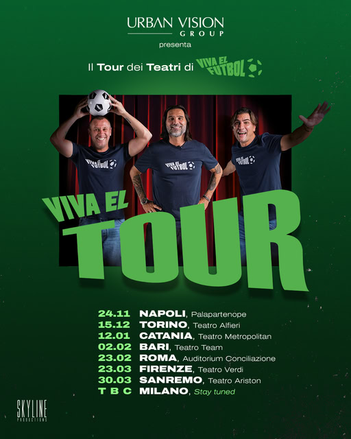 Dallo studio al palcoscenico. ‘Viva El Futbol’, il talk sportivo che ha conquistato il web, debutta nei teatri con ‘Viva El Tour’, un progetto live, nato nell’ambito dell’accordo con Urban Vision Group prodotto con il supporto di Skyline Srl, che intreccia calcio, cultura e linguaggi pop. Sul palco, pronti a incontrare la platea, Lele Adani, Antonio Cassano e Nicola Ventola, affiancati per l’occasione da Corrado Tedeschi. Talk, dibattiti, domande e interazione con il pubblico renderanno ogni tappa un evento unico, a metà tra racconto e partecipazione collettiva.