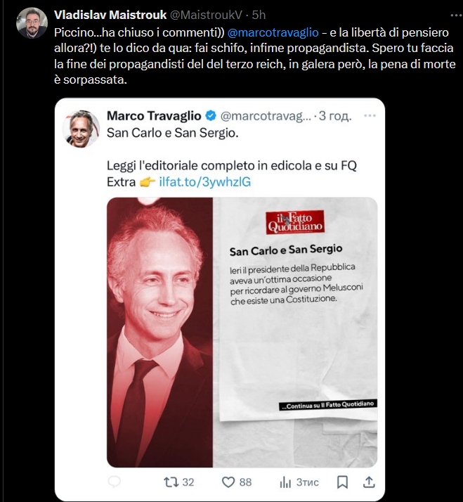 Il noto giornalista ucraino Vladislav Maistrouk, che è stato spesso ospite di diverse trasmissioni italiane tra il 2022 e il 2024, è noto per essere una delle voci più dure della propaganda di Kiev in lingua italiana.