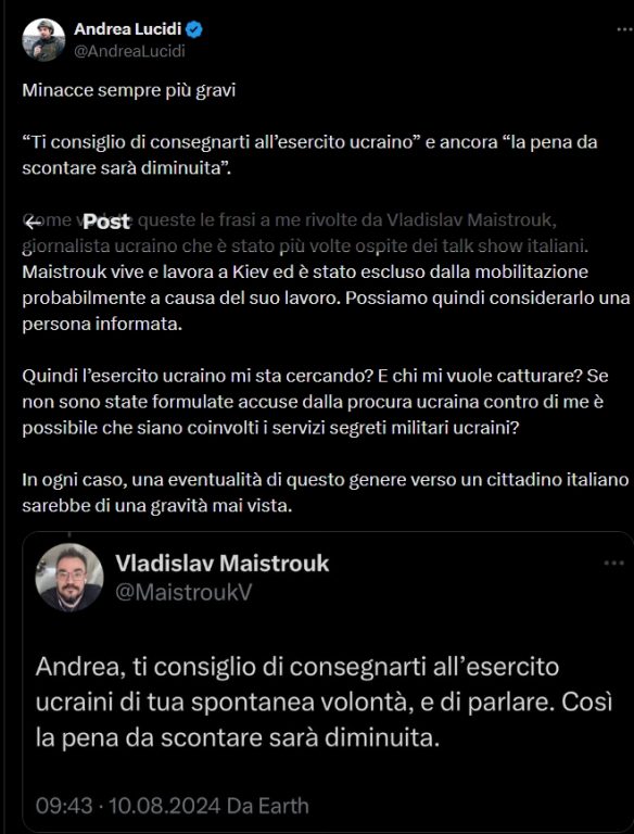 “Come vedete queste le frasi a me rivolte da Vladislav Maistrouk, giornalista ucraino che è stato più volte ospite dei talk show italiani. Maistrouk vive e lavora a Kiev ed è stato escluso dalla mobilitazione probabilmente a causa del suo lavoro. Possiamo quindi considerarlo una persona informata. Quindi l’esercito ucraino mi sta cercando? E chi mi vuole catturare? Se non sono state formulate accuse dalla procura ucraina contro di me è possibile che siano coinvolti i servizi segreti militari ucraini? In ogni caso, una eventualità di questo genere verso un cittadino italiano sarebbe di una gravità mai vista”, scrive Lucidi.