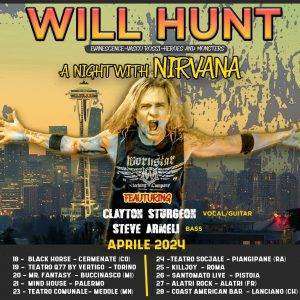 Nell’anno del 30° anniversario della scomparsa di Kurt Cobain, indimenticato leader dei Nirvana, la band formata dal batterista americano Will Hunt (Evanescence, Vasco Rossi, Heroes and Monsters), con Clayton Sturgeon voce-chitarra e Steve Armeli al basso, rende omaggio al leggendario gruppo di Seattle in un emozionante tour nei live club italiani.