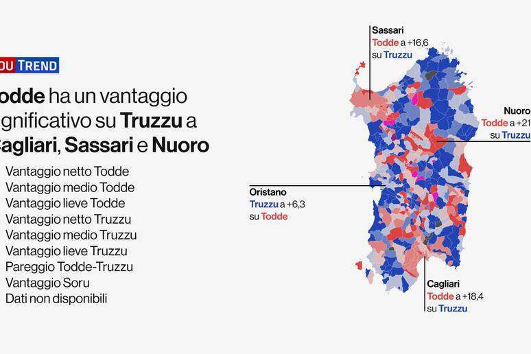 Le mappe del voto elaborate da YouTrend mostrano che la circoscrizione in cui Truzzu ha il maggior vantaggio su Todde è Olbia-Tempio (56,4% Truzzu vs 37,9% Todde), mentre quella in cui Todde ha il maggior vantaggio su Truzzu è Cagliari (49,3% Todde vs 41,2% Truzzu). Se si guarda il voto nei capoluoghi, vediamo un vantaggio di Todde su Truzzu compreso tra i 15 e i 20 punti nei due comuni principali, ossia Cagliari e Sassari, e di 21 punti a Nuoro, città in cui Todde risiede. A Oristano, invece, ha vinto Truzzu con 6 punti di vantaggio su Todde.