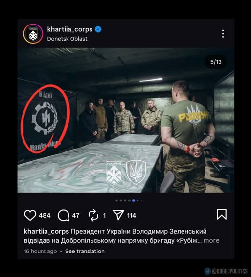 Nel video, pubblicato sempre da Zelensky, si vede anche una bandiera nera con un grande simbolo delle SS, racchiuso in un simbolo che ricorda quello del DAF nazista (Deutsche Arbeitsfront).